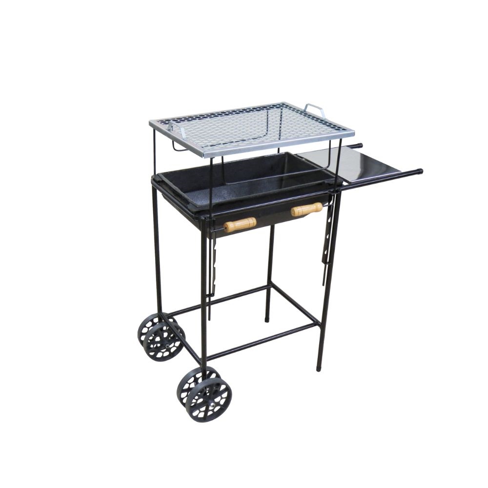 Churrasqueira Mineira bojo extra grande - com carrinho, grelha e tabuleiro em aço inox: